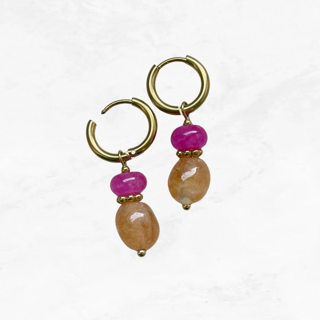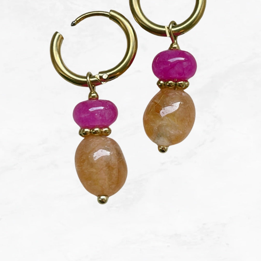 De Bailey oorbellen met licht oranje en fuchsia bedel van natuursteen met daartussen en gouden rvs ringetje. De oorbellen hebben een handig klik-systeem waardoor je ze makkelijk dicht kunt klikken.