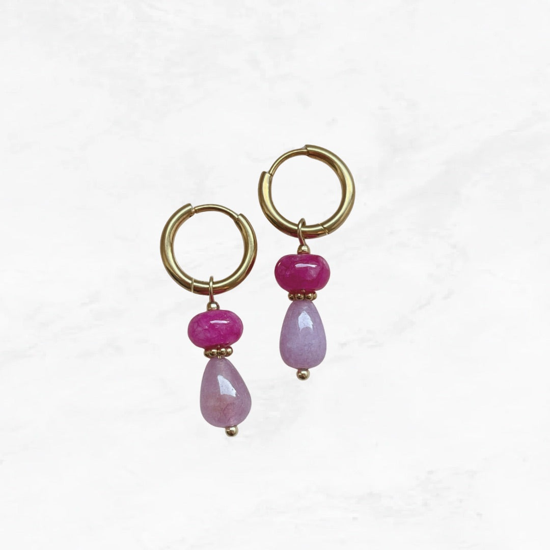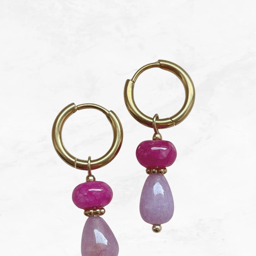 De Baau oorbellen met een combinatie van een licht lila en fuchsia bedel van natuursteen met daartussen en gouden rvs ringetje. De oorbellen hebben een handig klik-systeem waardoor je ze makkelijk dicht kunt klikken.