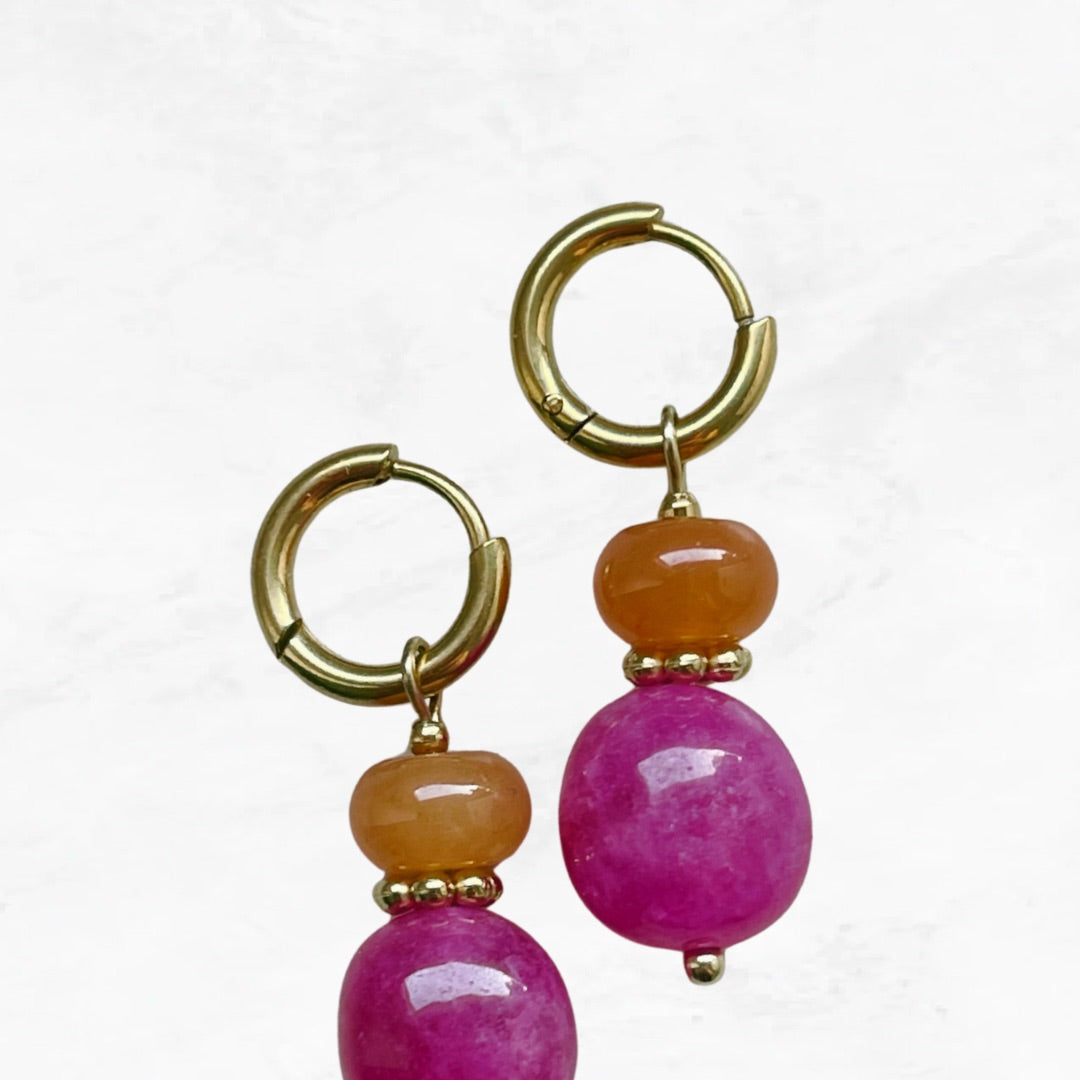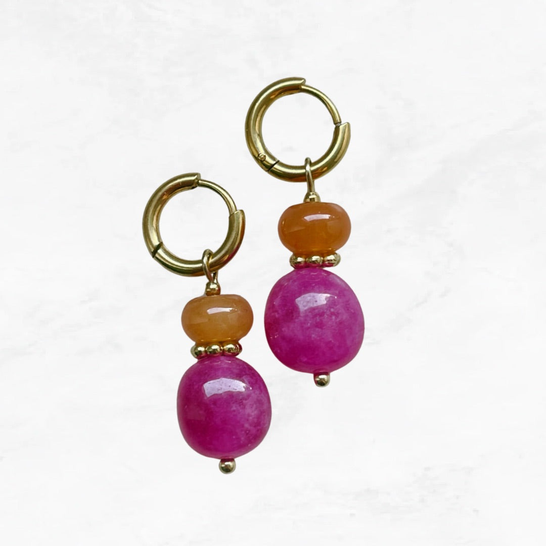 De Billie oorbellen met warm oranje en fuchsia bedel van natuursteen met daartussen en gouden rvs ringetje. Heel mooi op zichzelf en om te combineren!