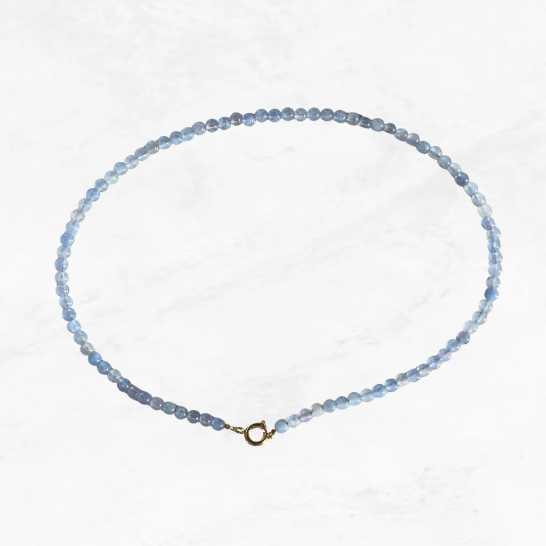 Korte statement ketting met lichtblauwe natuurstenen kralen gecombineerd met een goudkleurige sluiting. Lengte van de ketting met sluiting is 40 cm, diameter van de kraal is 0,5 cm. Heel leuk om te combineren, maar ook op zichzelf al een echt statement.