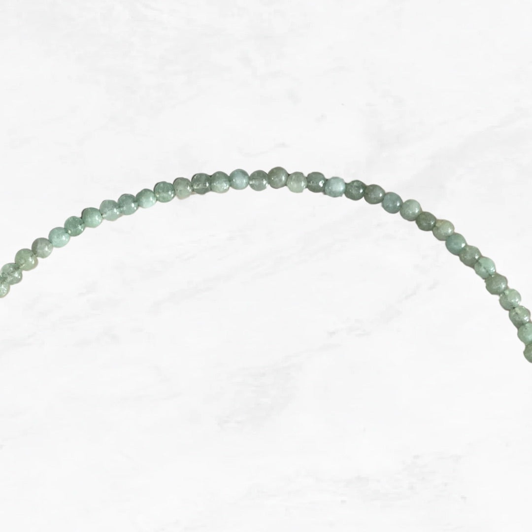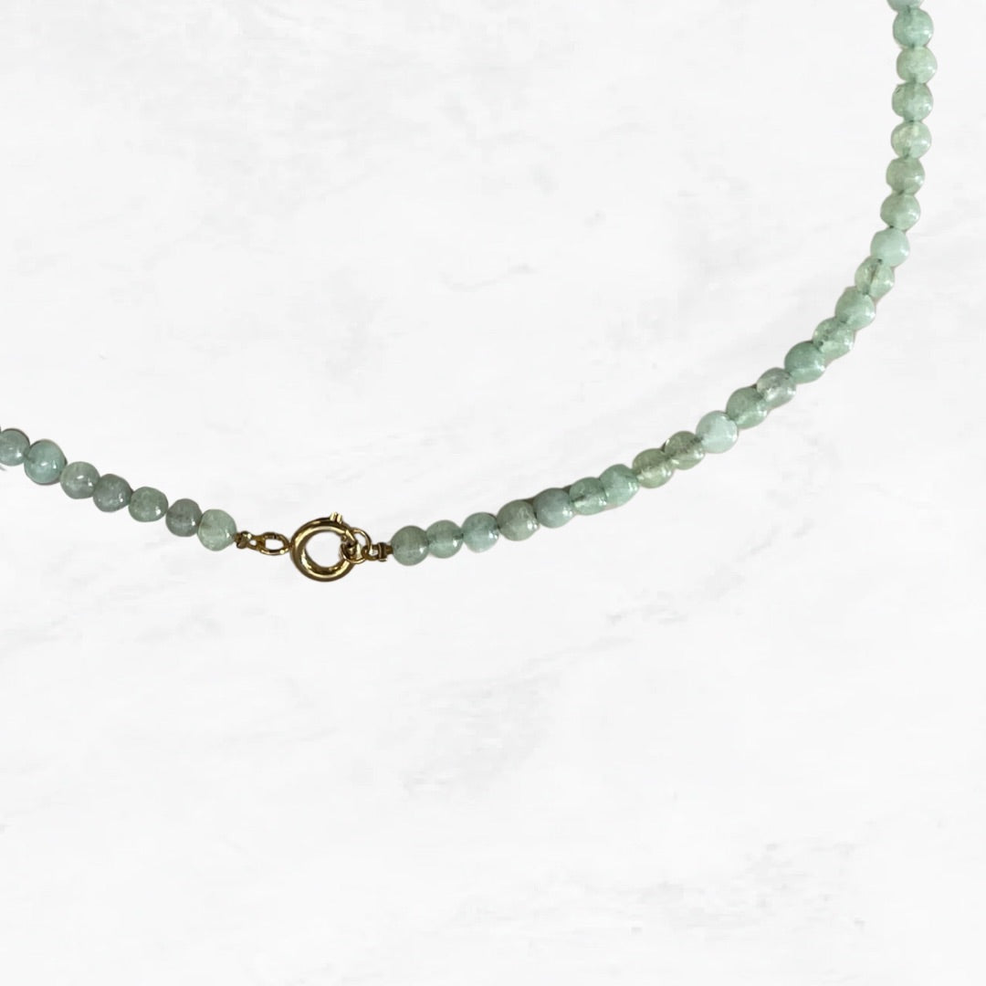 Korte statement ketting met lichtgroene natuurstenen kralen gecombineerd met een goudkleurige sluiting. Lengte van de ketting met sluiting is 40 cm, diameter van de kraal is 0,5 cm. Heel leuk om te combineren, maar ook op zichzelf al een echt statement.