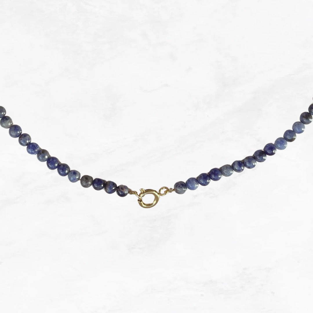 Korte statement ketting met donkerblauwe natuurstenen kralen gecombineerd met een goudkleurige sluiting. Lengte van de ketting met sluiting is 40 cm, diameter van de kraal is 0,5 cm. Heel leuk om te combineren, maar ook op zichzelf al een echt statement.